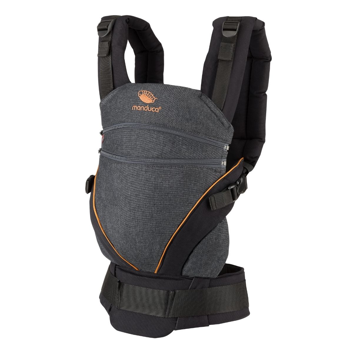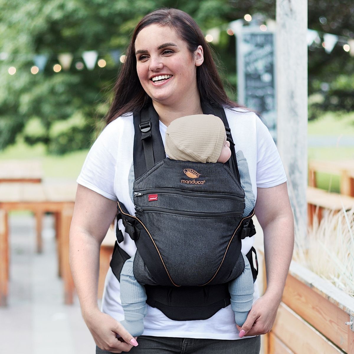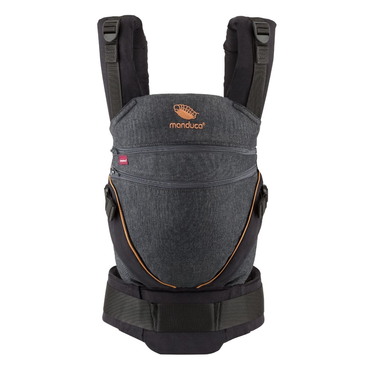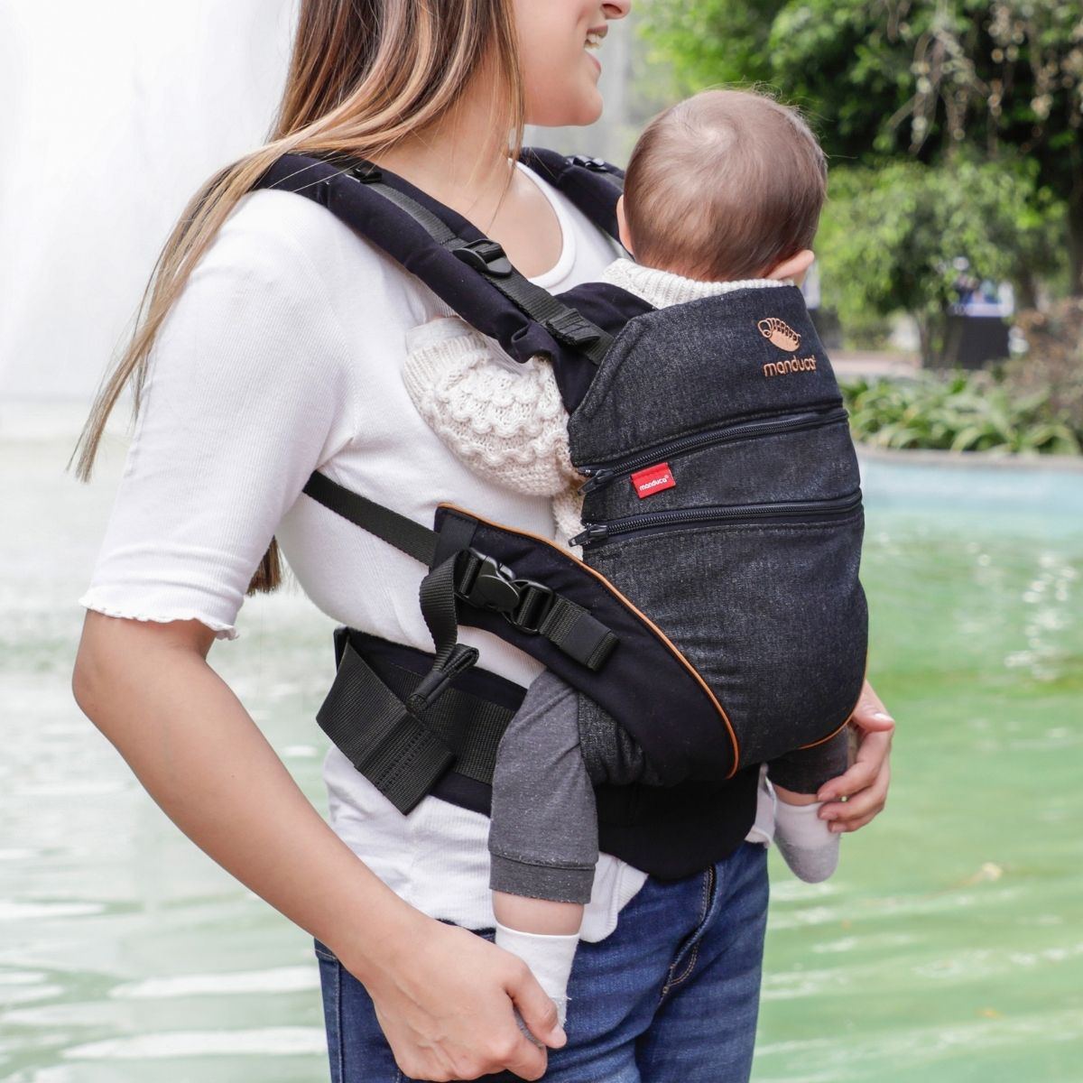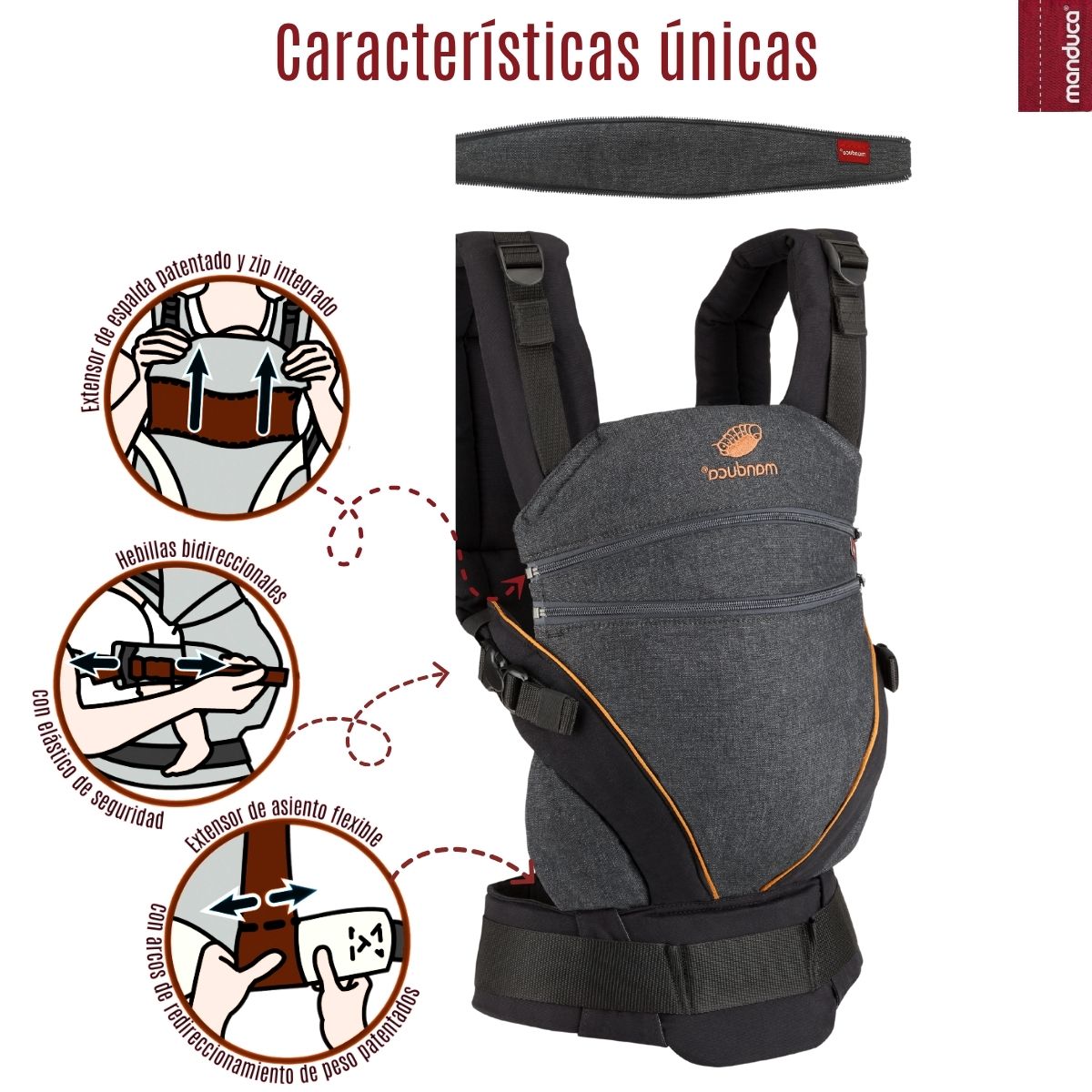 El color Denim Black resalta por su apariencia tipo mezclilla en negro profundo, lo que le da un aire contemporáneo, limpio y muy funcional. Es ideal para mamás y papás que prefieren un portabebé Manduca con presencia discreta, elegante y fácil de integrar en la rutina diaria.