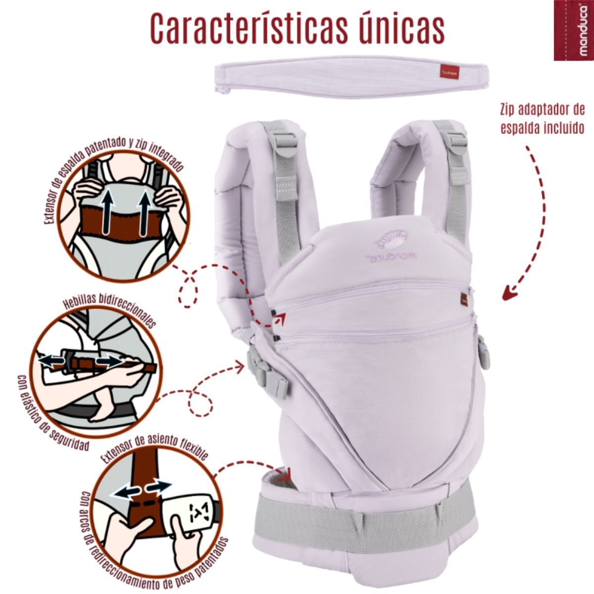 El color Monochrome Lavender aporta un toque de calma, ternura y armonía. Es un tono lila claro, neutro y elegante que se adapta a cualquier temporada y se ve bien tanto en mamá como en papá. Esta versión forma parte de la línea continua de Manduca, disponible de forma permanente.