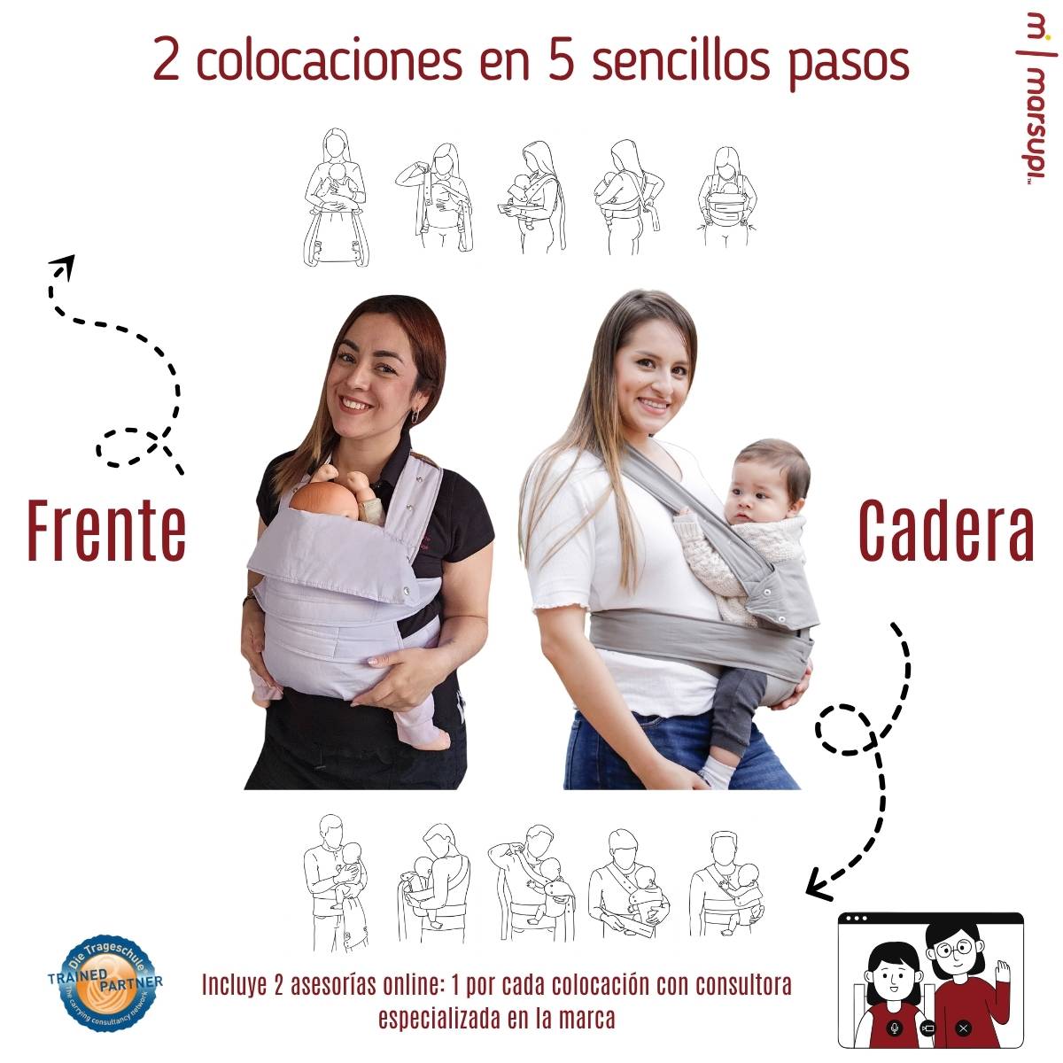 Ofrece dos posiciones de porteo: al frente y en la cadera, ambas seguras y recomendadas por especialistas en desarrollo infantil. También incluye soporte de cabeza y adaptador para recién nacidos, para que lo puedas usar desde los primeros días.