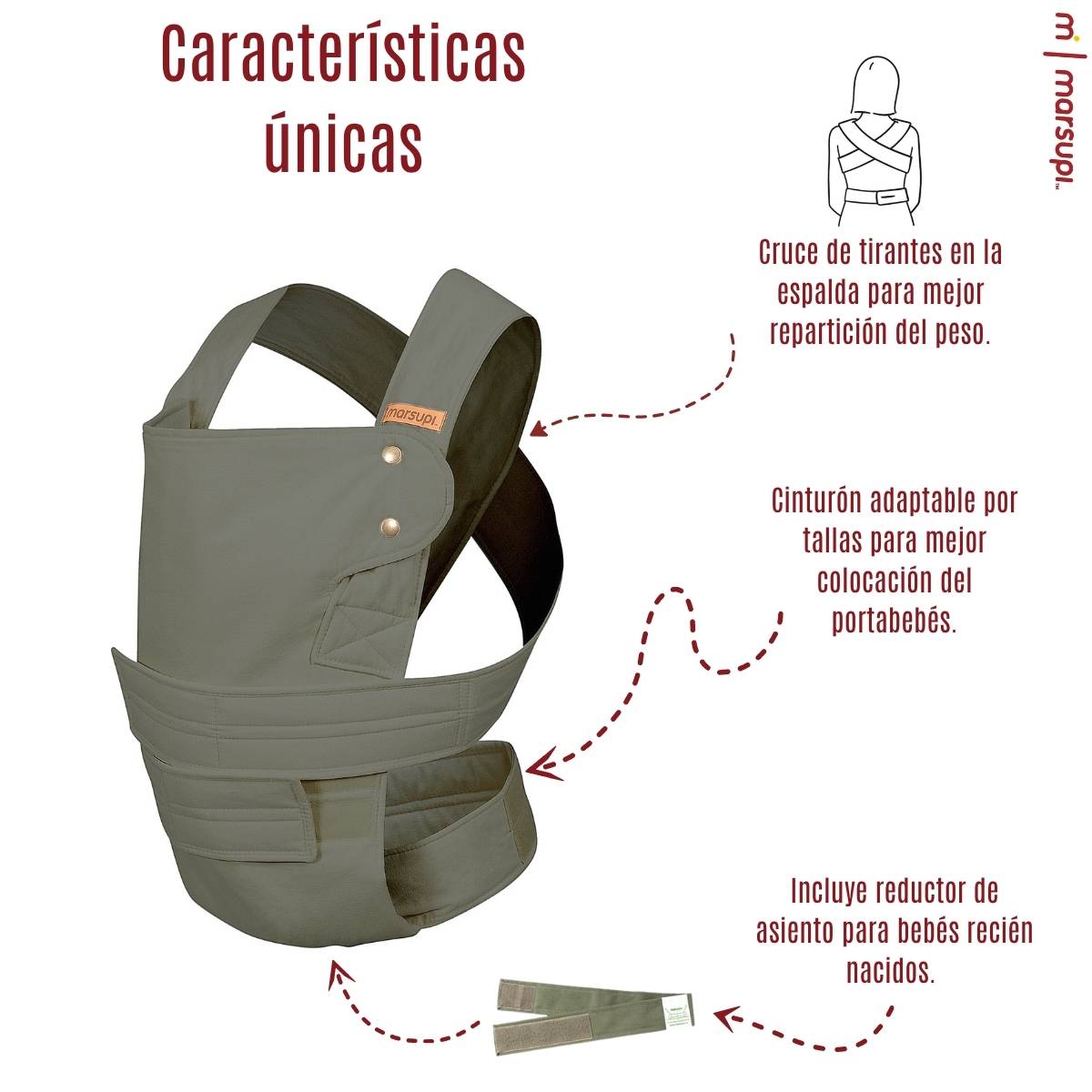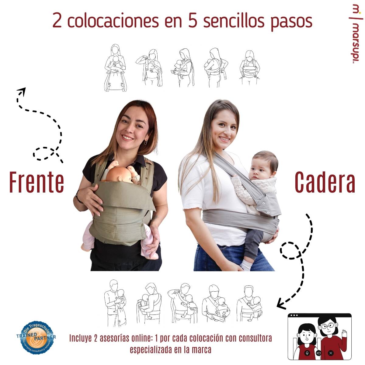 Ofrece dos posiciones de porteo: al frente y en la cadera, ambas respetando la posición en “M” recomendada por ortopediatras en México. Su soporte de cabeza integrado brinda estabilidad y protección, especialmente útil durante los primeros meses. También incluye un adaptador para recién nacido y una bolsa de transporte.